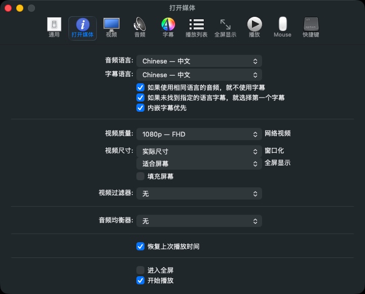开启媒体时,可以套用许多默认偏好设置。